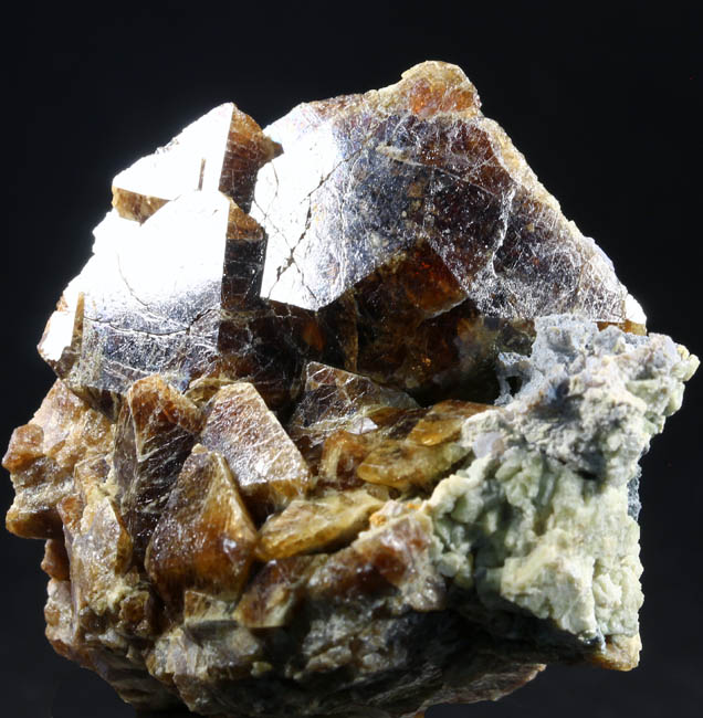 JC9229. Vesuvianite. Near Clio, Plumas county, California. 4 x 4.5 cm 83g. $25.00. A main crystal that measures 2.5 cm across, slightly translucent and pretty much damage free except for a little bit of growth interference. Color is a root beer brown as shown. Classic shape and form of a flattened di-pyramid. The flat face in the center of the crystal does not show well in the photos. A bit of pale green diopside and corroded siliceous material is also present. Mined in 2012. |