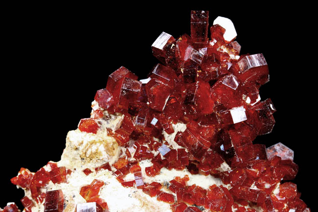 JC9909. Vanadinite. Mibladen, Morocco mines. 6 x 8 cm 113g $135.00 Dark red rather gemmy crystals. Only damage is at the very top where one crystal looks like it has been partially cleaved, visible in this photo. Collected in 2019. Pretty piece. |