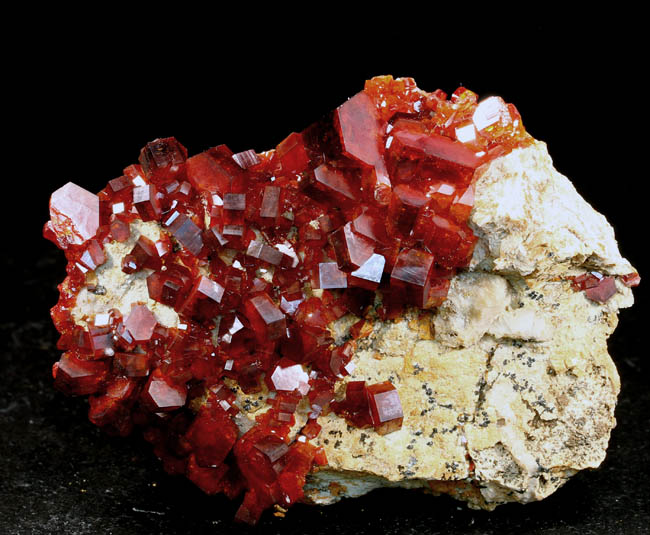 JC9908. Vanadinite. Mibladen, Morocco mines. Morocco. 6 x 7 cm 77g $110.00 Dark red crystals with brilliant luster on whitish matrix. Collected in 2019. Pretty piece. |