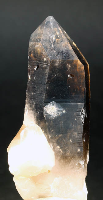 JC9991. Quartz. Petersen Mountain, Hallelujah Junction area, Washoe County, Nevada. 2.5 x 7 cm 74g $10.00. I collected this one in 2012. Hoping to find a vug of scepters, instead found a small vug with nice clean transparent non-sceptered crystals. Two of them are represented here. This photo shows the crystal partially back lit. |