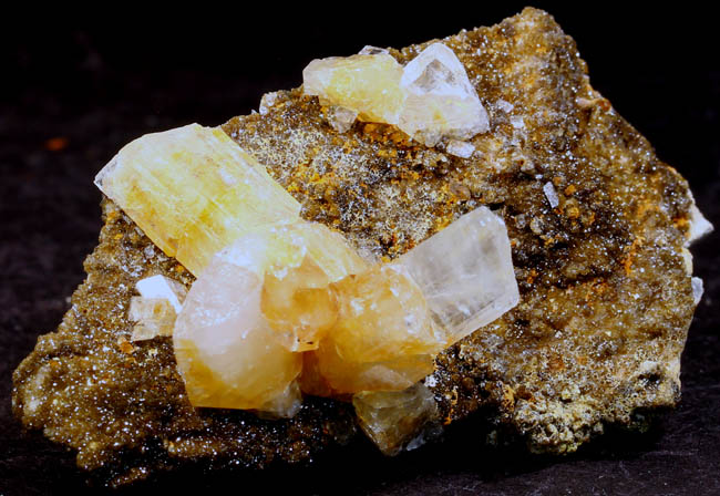 BR360. Mimetite. Tsumeb mine, Tsumeb, Namibia. 3.5 x 3.5 x 3 cm 55g $275.00. Stout yellowish amber crystals from the "Gem Pocket". 1971 saw the discovery of the famous Mimetite “Gem Pocket", one of Tsumeb's great pockets. According to one dealer, he states "Indeed, according to most people who score such things, this find has not been surpassed since by any Mimetite from any location for size and quality of transparency" Ex: Donald K. Olson Minerals Purchased: 10-2001 |