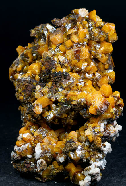 JC11892. Wulfenite. Erupcion/Ahumada mine, Los Lamentos, Chihuahua, Mexico. 5 x 5.5 x 9 cm 382g $125.00 Leaning towards bipyramidal terminations, this is one of the older pieces that came out in the 1960's. A bit of descloizite & calcite here and there. I photographed it from all angles, and front and back. Not perfect, but a nice representative piece from the earlier finds. |