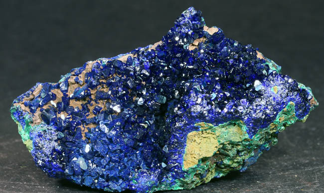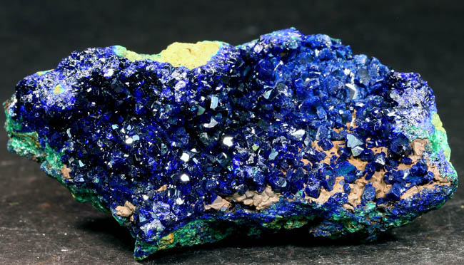 JC11907. Azurite. Liufengshan Mine, Guichi District, Chizhou, Anhui, China. 3 x 6.5 cm 64g $25.00. Bright luster crystals typical of this mine. |