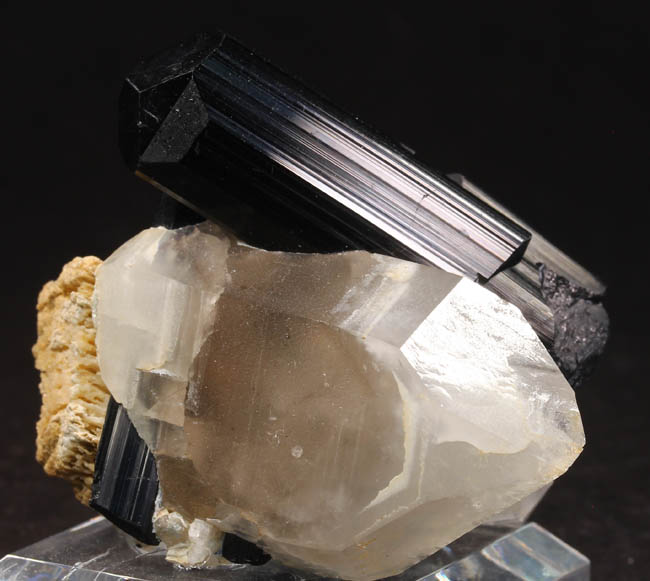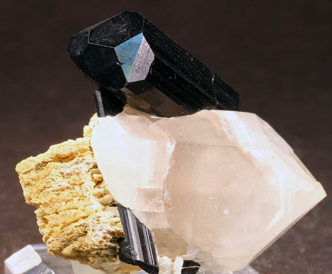 JC12043. Schorl, quartz. Shigar Valley, Skardu District, Baltistan, Northern Areas, Pakistan . 5 x 5 cm 68g $35.00 A sharp, lustrous schorl crystal on quartz crystal. Mounted on a stand. Displays nicely. |