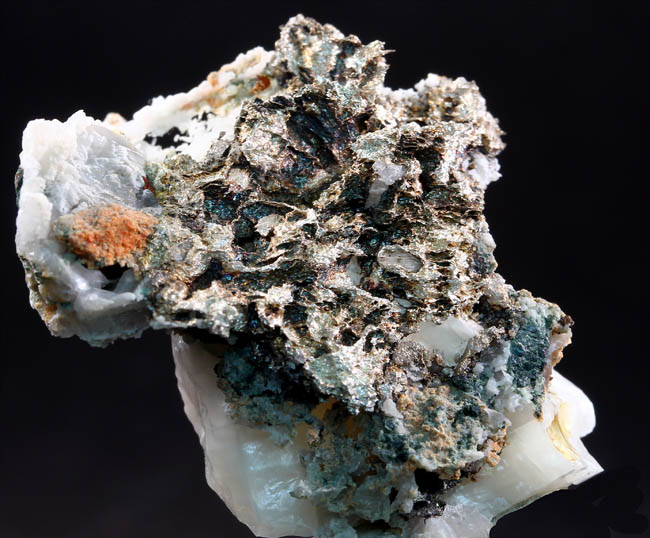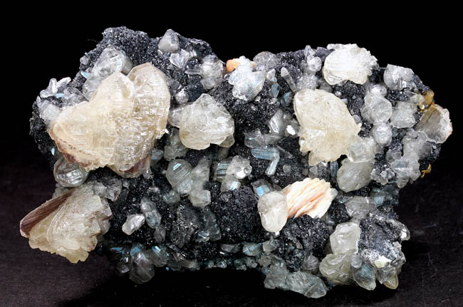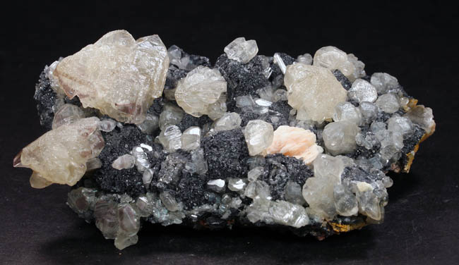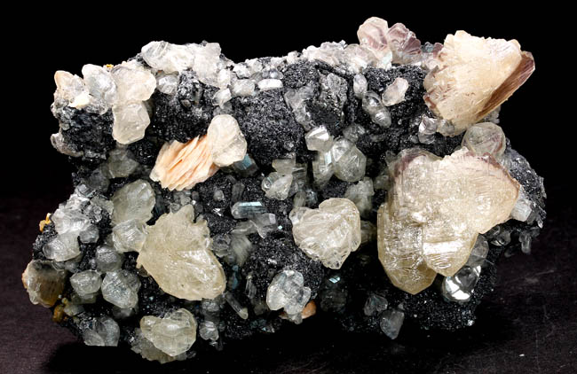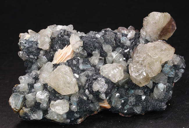 JC13860. Cerussite, barite, galena. Mibladen mining district, Midelt Province, Drâa-Tafilalet Region, Morocco. 9.1 x 5.5 x 2.6 cm 262g. $75.00. A better than average piece with nice sized cerussite scattered around on the galena matrix, with a small flower of pinkish barite for contrast. |