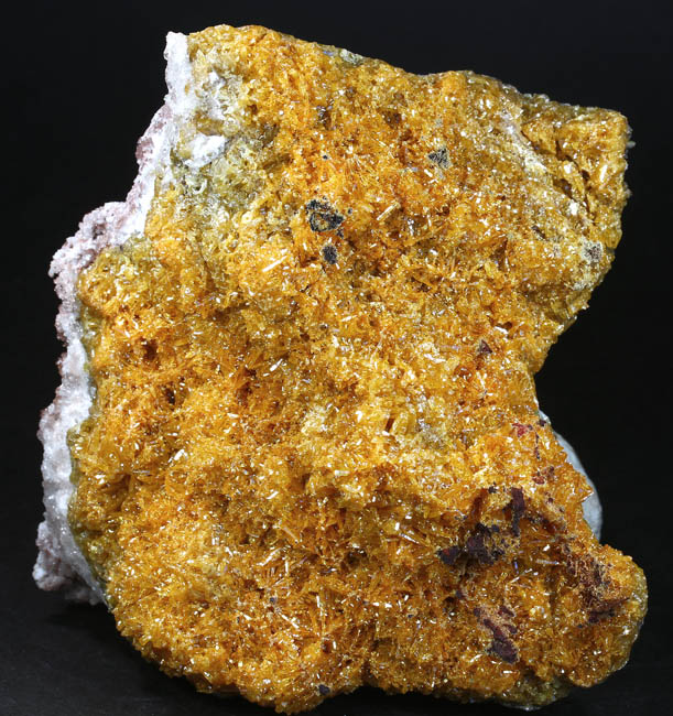 JC13865. Mimetite. Santa Eulalia Mining District, Aquiles Serdán Municipality, Chihuahua, Mexico. 8.5 x 8.5 x 3 cm 478g. $90.00. Brilliant yellow, tiny, acicular crystals making a near solid mass of mimetite. These first came out around 2009, and this year at Tucson there were a few more scattered around, apparently newly collected from the same area as the earlier ones like this. Pretty and sparkly. The back side is drusy calcite. Better in person. RESERVED |
