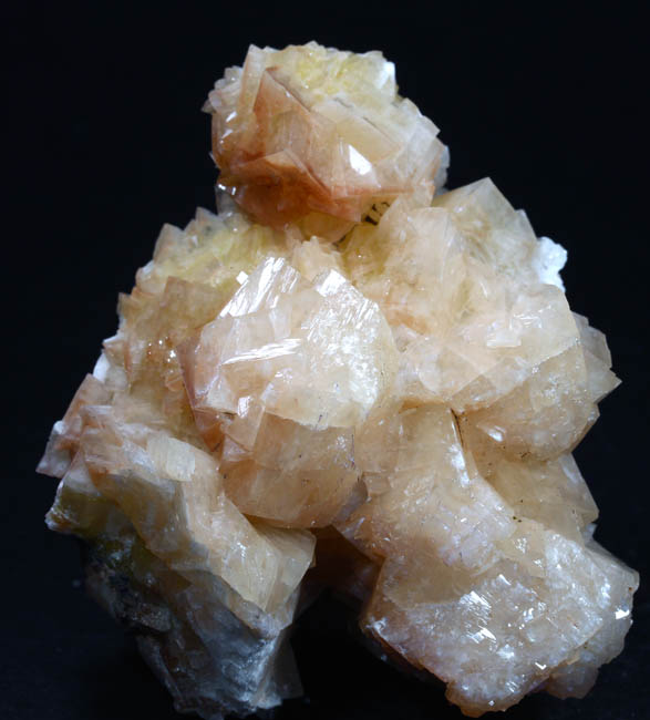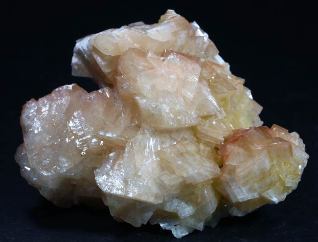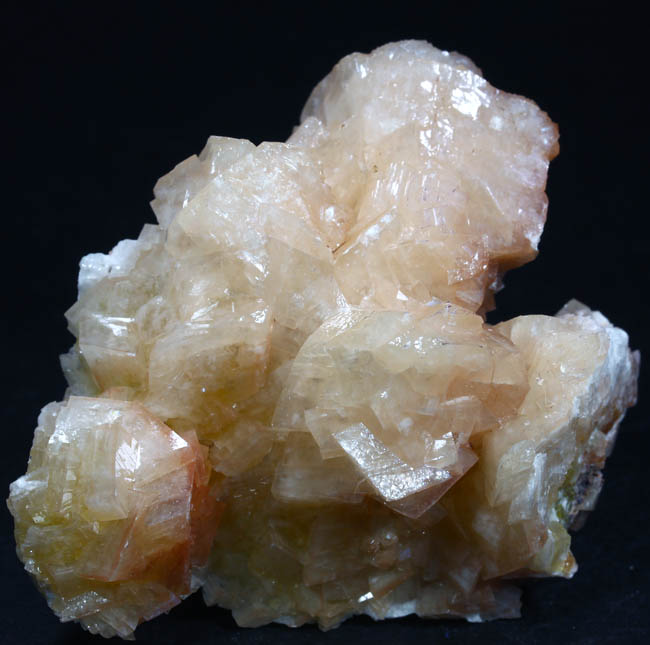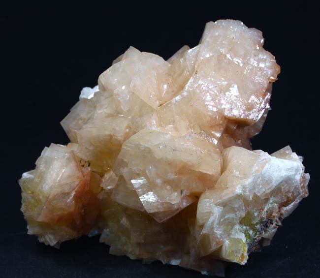 JC13867. Chabazite. Santa Eulalia Mining District, Aquiles Serdán Municipality, Chihuahua, Mexico. 7 x 5.5 x 2 cm 135g $25.00. Blocky, lustrous, sort of cream color crystals with hints of yellow. I saw several of these scattered around at Tucson, 2026. Some of them have included yellow mimetite. This group has hints of that in the yellowish areas around the base and in the yellowish crystals. |