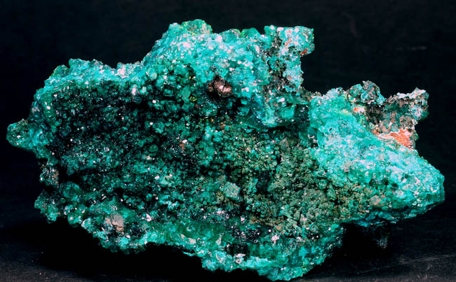 JC13871. Dioptase, plancheite. Tantara mine? Shinkolobwe, Kambove Territory, Haut-Katanga, DR Congo. 10 x 5.5 x 6.5 cm 267g $50.00. Sparkly dark green dioptase crystals along the inside top area, with lighter green crystals across the flat area, and a single dark crystal sitting on top of the small crystals...a bit different, with two generations of dioptase, most obvious being the single crystal in the center left sitting on the small, lighter colored crystals. |