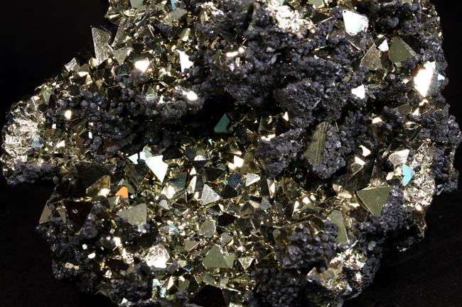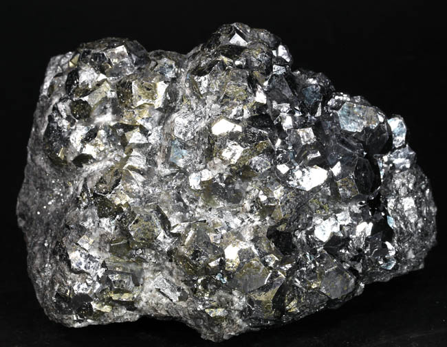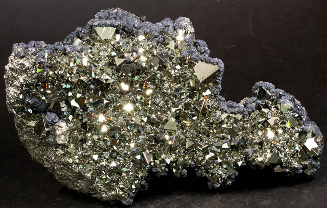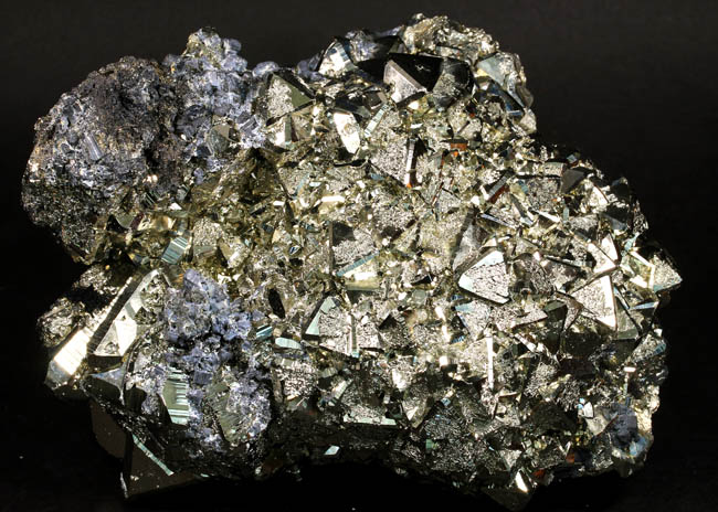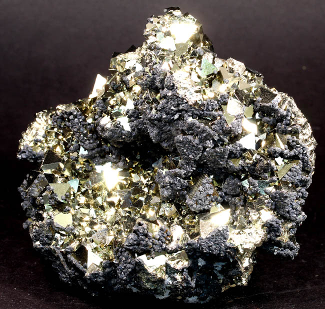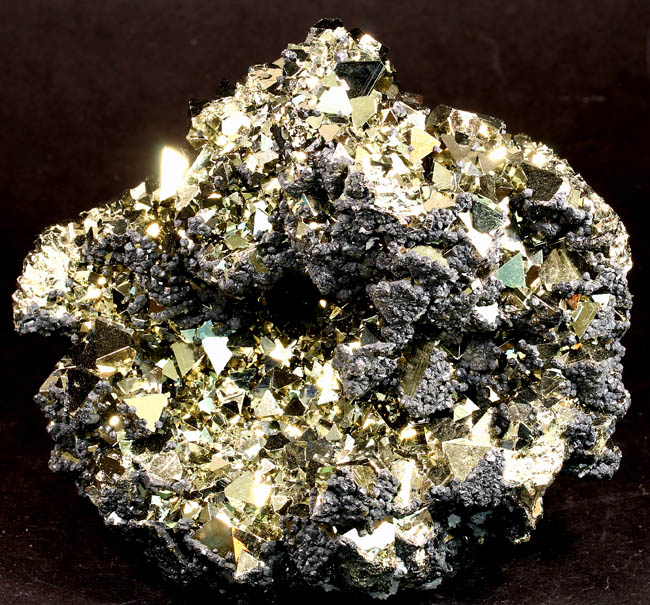 JC13911. Pyrite, sphalerite. Huanzala Mine, Huanzala, Huallanca District, Bolognesi Province, Ancash, Peru. 10 x 9 x 6 cm 996g $150.00. Brilliant octahedral crystals set off by contrasting small near black sphalerite crystals. These are from a recent hit at Huanzala, and are outstanding for their brilliance and placement of the octahedrons. Seems like everyone has a Huanzala pyrite, but these are really exquisite and stand out beautifully in any cabinet. It is hard to get good photos because of the brilliance of the pyrite, and I have photographed this one from several angles. |