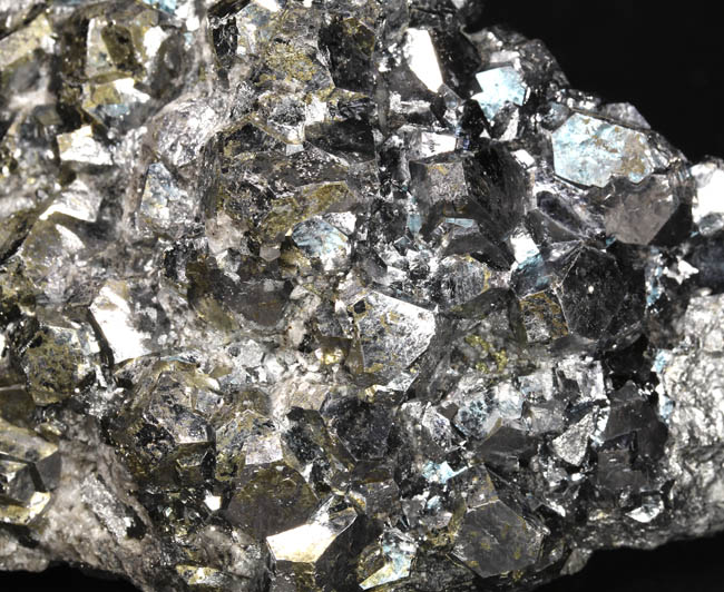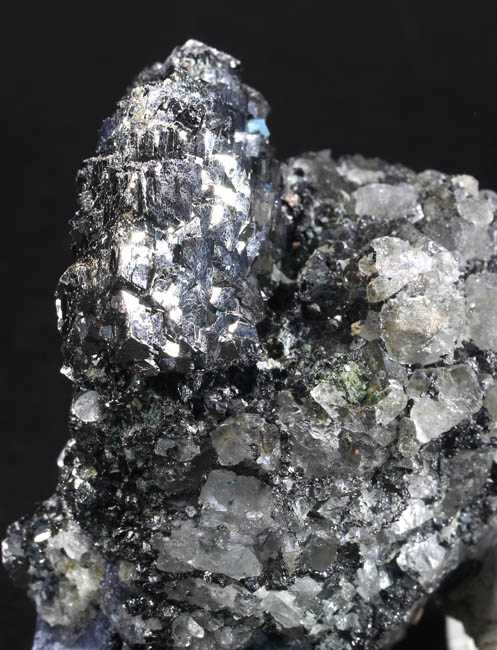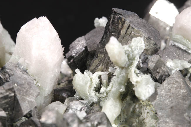 JC13915. A close up of the gray crystals...obviously not galena...sort of striated to acicular looking...bournonite? Although betekhtinite has not been reported from Huanzala, these sure look like that mineral. Be nice to have an x-ray machine handy. |