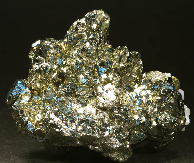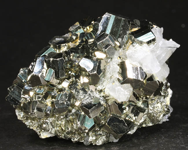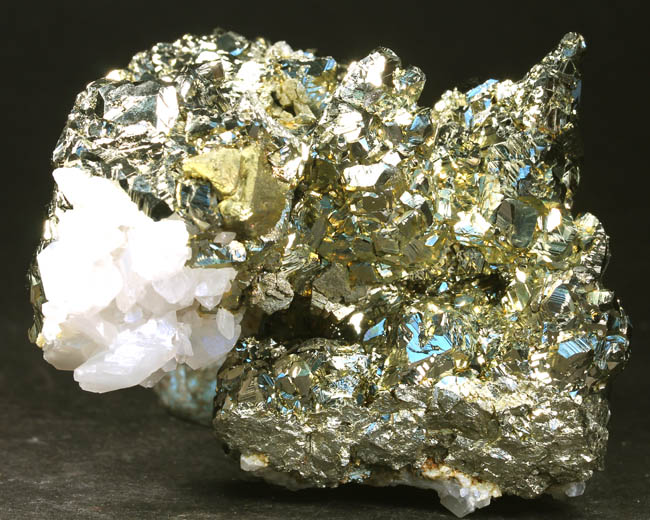JC13917. Pyrite pseudo pyrrhotite, calcite, chalcopyrite. Trepca, Mitrovica, Kosovo. 7 x 6 x 5 cm 310g $110.00 Ex Harry Critchley coll.#4497 Ex: Muki-Minerals, Munich show. 10-2013. Bright lustrous golden crystals of pyrite forming replacements after previous pseudo-hexagonal twinned pyrrhotite crystals measuring to almost 2.5 cm in height. Calcite is present as well, in flattened crystals on the lower left in this photo. A small grouping of golden chalcopyrite crystals are present also. The lustrous, well-formed crystals have brilliant luster and bright reflectivity throughout. As one dealer described this one: "Pyrite pseudomorphs after Pyrrhotite represent one of the more fascinating examples of mineral replacement in the collector world. This gorgeous specimen from the renowned Trepča Mine in Kosovo showcases a beautiful group of bright metallic golden Pyrite that has completely replaced the original Pyrrhotite." |