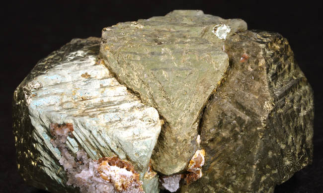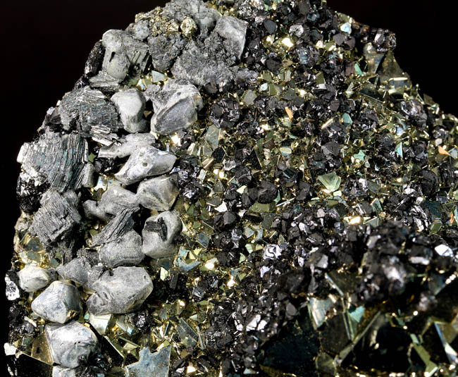 JC13915. Pyrite, sphalerite, galena, bournonite?. Huanzala Mine, Huanzala, Huallanca District, Bolognesi Province, Ancash, Peru. 10.5 x 8.5 x 4.5 cm 1092g $115.00 Galena? or ? crystals across the top, with a different mineral associated, looks like bournonite or something else, with small near black sphalerite scattered around the lower part, and the pyrite shining through. Although the dealer said these are galena across the top, at least some of them are definitely not galena...they are sort of striated, and remind me of bournonite or ?. This can be seen a little bit in the two topmost crystals and is more obvious in the lowest close up photo here. Looks way better in person. RESERVED |