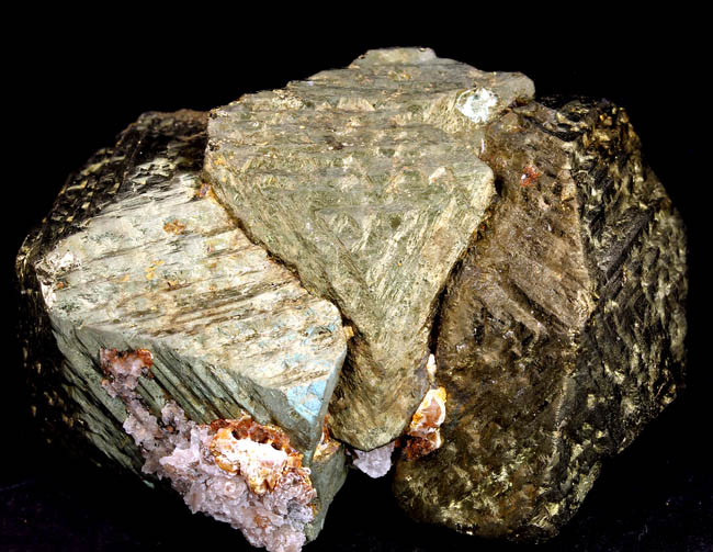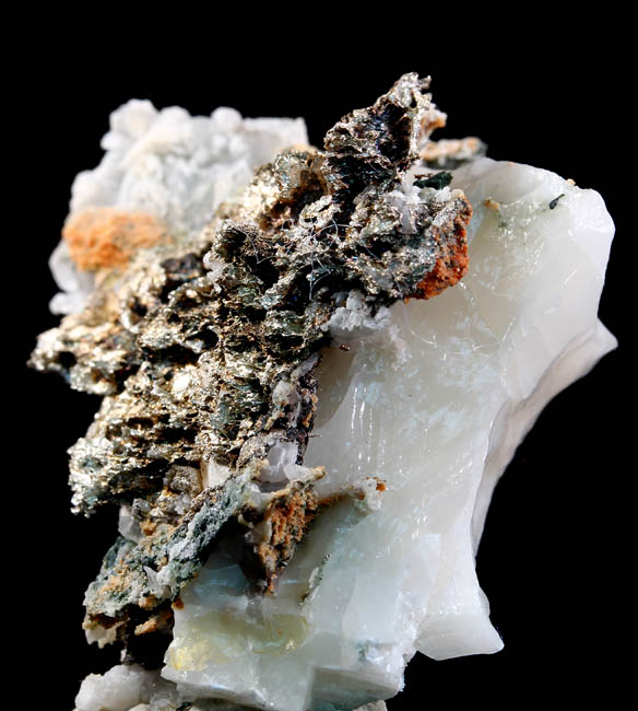 JC13889. Arsenopyrite, fluorite. Huanggang Fe-Sn deposit, Hexigten Banner, Chifeng City, Inner Mongolia, China. 8 x 5.5 x 5 cm 201g $60.00. A somewhat flat plate of brilliant luster arsenopyrite resting on colorless fluorite cleavages. When looked at from the side, like in the lower photo, it is sort of lozenge shaped. Very bright luster, mirror like. Looks good in person. So brilliant, hard to photo. |