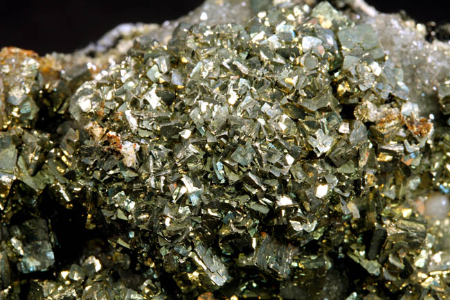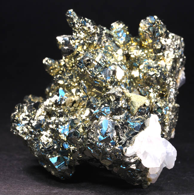 JC13904. Pyrite. Borieva Mine, Madan Municipality, Smolyan Province, Bulgaria. 7.5 x 5 x 2.5 cm 246g $25.00. Specimen completely covered with bright cubic pyrite. Lots of sparkle and pretty. Pyrite is in mound like appearance, on a quartz matrix. Much better in person. There are 3 main mounds, one top, one lower left, and one lower right, giving it a more 3 dimensional look than the photo indicates. |