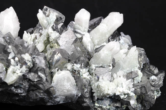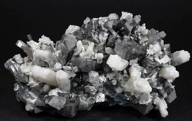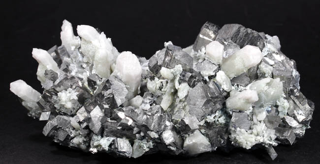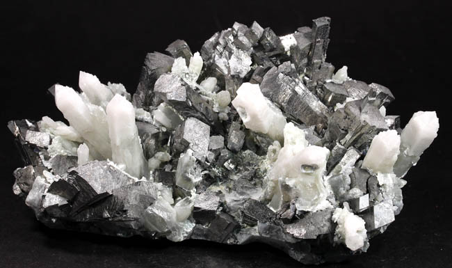 JC13909. Arsenopyrite, quartz. Huanggang Fe-Sn deposit, Hexigten Banner, Chifeng City, Inner Mongolia, China 12 x 7 x 4.5 cm 715g $250.00 From a recent find at the Huanggang mine complex. Silver, bright arsenopyrite crystals sticking straight up sort of like stubby pencils, intermixed with milky quartz crystals. There was only one Chinese dealer that had these, and they were rather pricey, so I just picked this one out of the half dozen pieces he had. Unusual for the arsenopyrites, as more columnar than normally seen, and some of them have a smaller columnar arsenopyrite on the end of the larger crystal. RESERVED |
