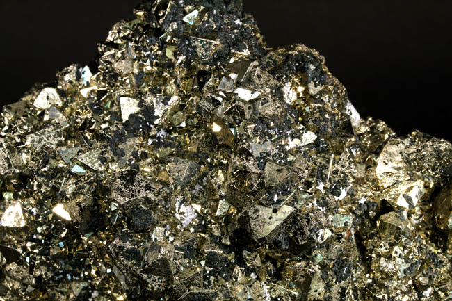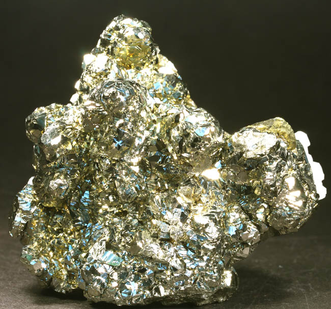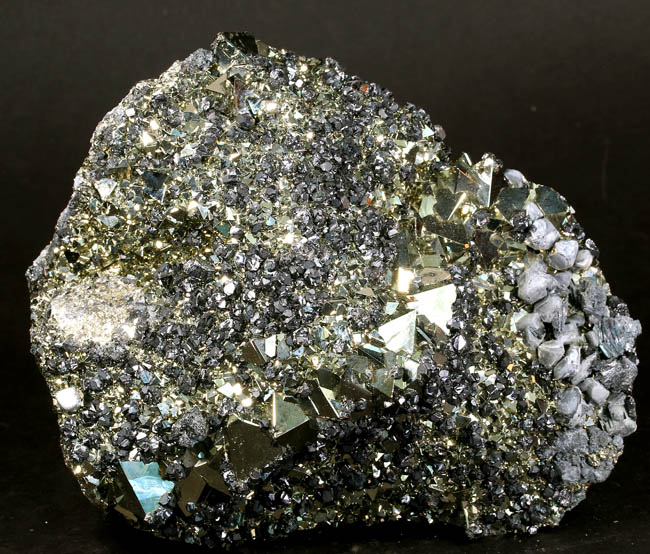 JC13913. Pyrite, sphalerite, bournonite. Huanzala Mine, Huanzala, Huallanca District, Bolognesi Province, Ancash, Peru. 13.5 x 10 x 4 cm 1,558g, nearly 3.5 Lbs., $175.00 Brilliant octahedral crystals set off by contrasting, scattered small, near black sphalerite crystals and silvery gray bournonite. These are from a recent hit at Huanzala, and are outstanding for their brilliance and placement of the octahedrons. Seems like everyone has a Huanzala pyrite, but these are really exquisite and stand out beautifully in any cabinet. It is hard to get good photos because of the brilliance of the pyrite, and I have photographed this one from three angles. |