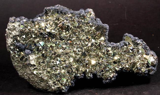JC13914. Pyrite, sphalerite, galena. Huanzala Mine, Huanzala, Huallanca District, Bolognesi Province, Ancash, Peru 13 x 8 x 2.5 cm 716g $110.00 Brilliant octahedral crystals set off by contrasting, gray galena? crystals forming a corona like effect around the edges. These are from a recent hit at Huanzala, and are outstanding for their brilliance and placement of the octahedrons. Seems like everyone has a Huanzala pyrite, but these are really exquisite and stand out beautifully in any cabinet. It is hard to get good photos because of the brilliance of the pyrite, and I have photographed this one from three angles. |