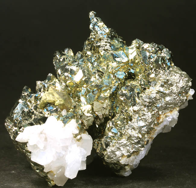 JC13896. Pyrite, quartz. Beruang Tengah Prospect, Beruang Kanan orefield, Gunung Mas Regency, Central Kalimantan Province, Indonesia. 7 x 5 x 2.5 cm 121g $90.00 Bright pyrite with quartz...the two quartz crystals on the middle right look like Japanese twins, but they are not...just have that angle to fool folks. The pyrite has brilliant, mirror like luster. There were a few of these around at Tucson, and were surprisingly pricey. |
